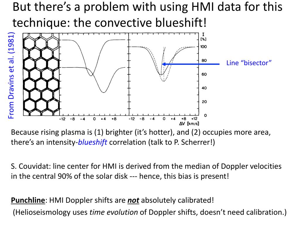 But there’s a problem with using HMIdata for this technique: the convective blueshift! Because rising plasma is (1) brighter (it’s hotter), and (2) occupies more area, there’s an intensity-blueshift correlation (talk to P. Scherrer!) S. Couvidat: line center for HMI is derived from the median of Doppler velocities in the central 90% of the solar disk --- hence, this bias is present! Punchline: HMI Doppler shifts are not absolutely calibrated! (Helioseismology uses time evolution of Doppler shifts, doesn’t need calibration.) Line “bisector” From Dravins et al. (1981)