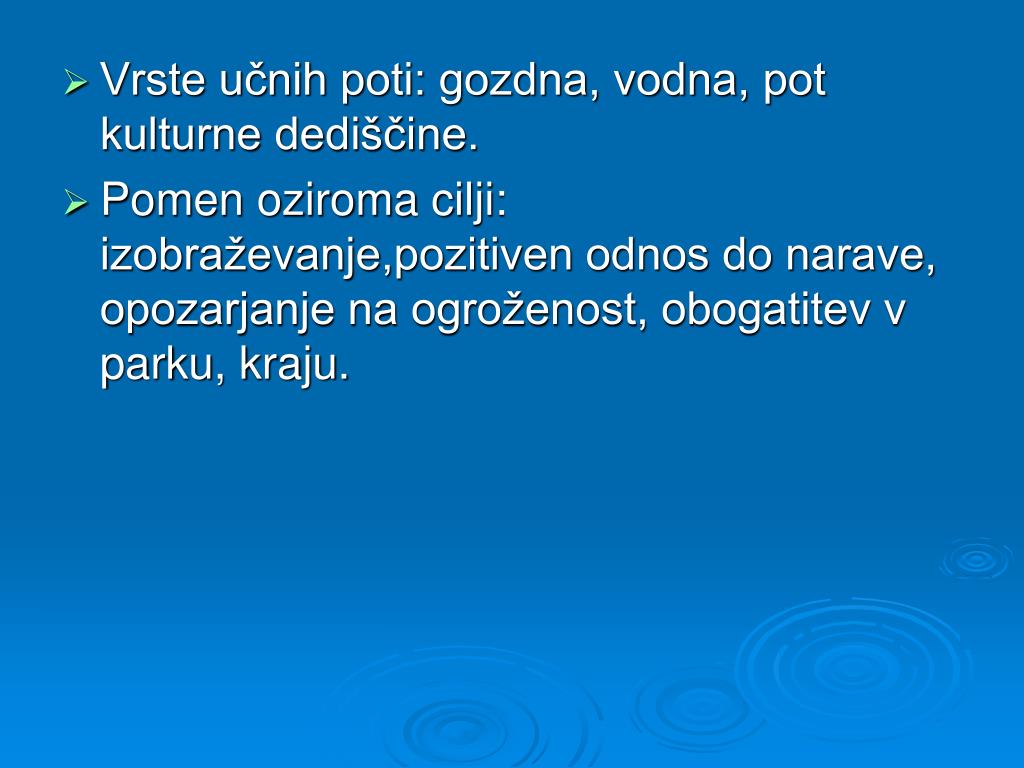 Vrste učnih poti: gozdna, vodna, pot kulturne dediščine. • Pomen oziroma cilji: izobraževanje,pozitiven odnos do narave, opozarjanje na ogroženost, obogatitev v parku, kraju.