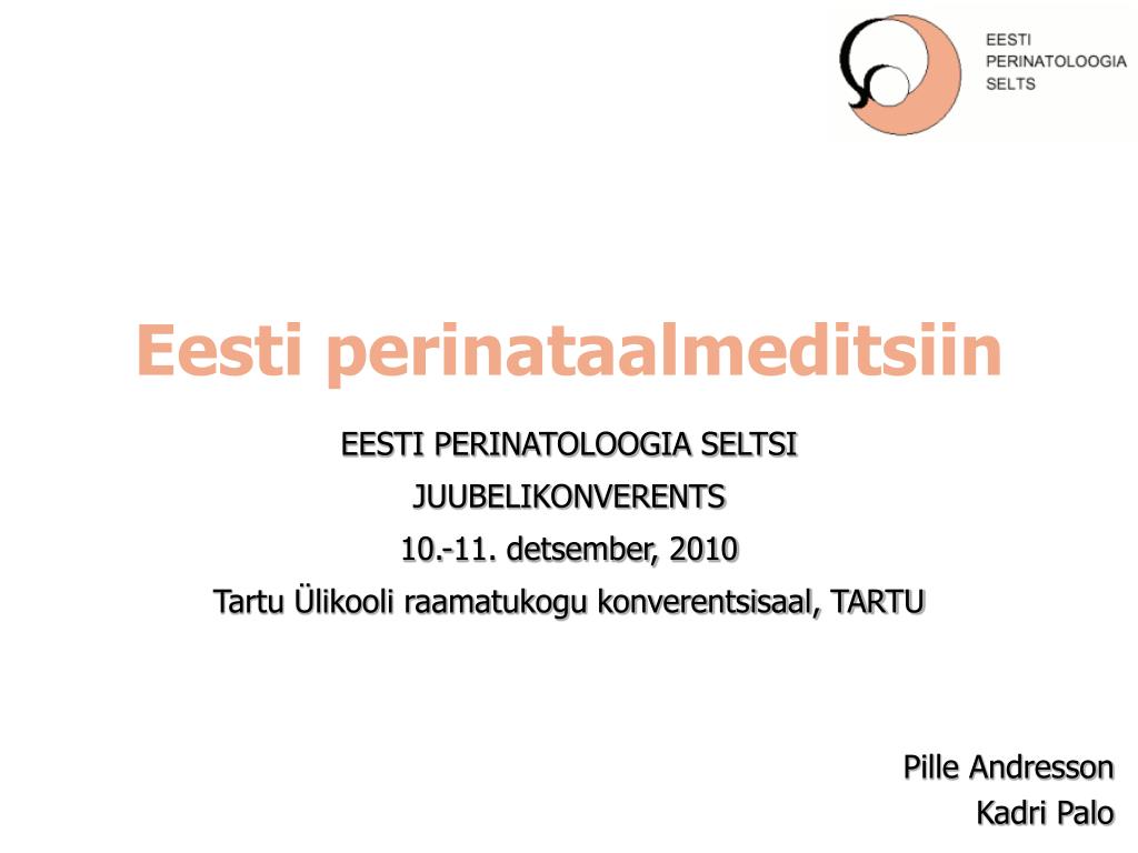 Eesti perinataalmeditsiin EESTI PERINATOLOOGIA SELTSI JUUBELIKONVERENTS 10.-11. detsember, 2010 Tartu Ülikooli raamatukogu konverentsisaal, TARTU Pille Andresson Kadri Palo
