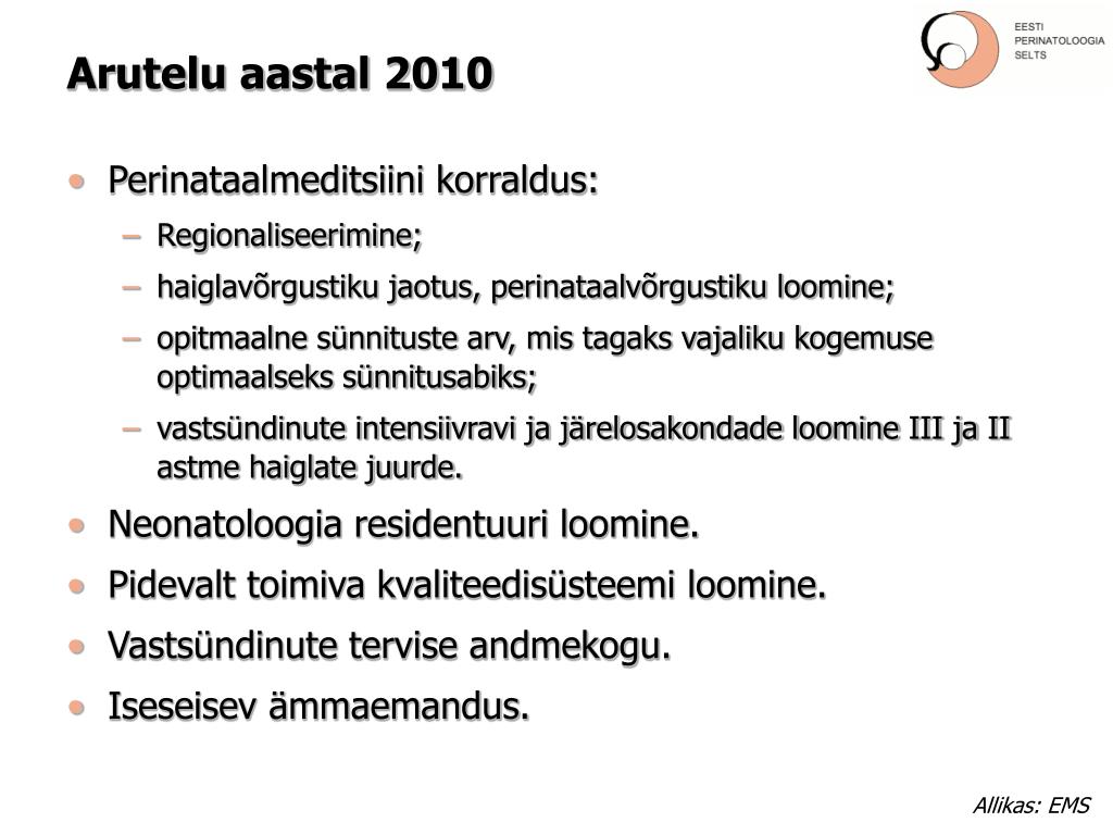 Arutelu aastal 2010 • Perinataalmeditsiini korraldus: • Regionaliseerimine; • haiglavõrgustiku jaotus, perinataalvõrgustiku loomine; • opitmaalne sünnituste arv, mis tagaks vajaliku kogemuse optimaalseks sünnitusabiks; • vastsündinute intensiivravi ja järelosakondade loomine III ja II astme haiglate juurde. • Neonatoloogia residentuuri loomine. • Pidevalt toimiva kvaliteedisüsteemi loomine. • Vastsündinute tervise andmekogu. • Iseseisev ämmaemandus.