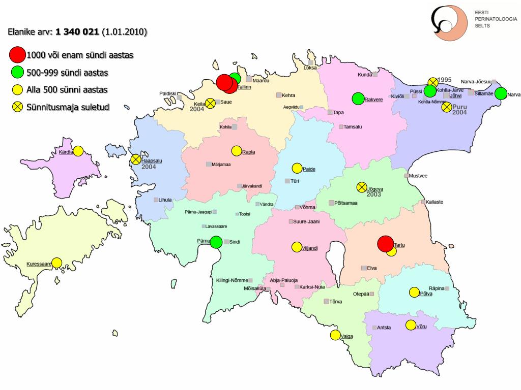 hjjhjhjhjh Elanike arv: 1 340 021 (1.01.2010) 1000 või enam sündi aastas 500-999 sündi aastas 1995 Alla 500 sünni aastas Sünnitusmaja suletud Puru 2004 2004 2004 2003