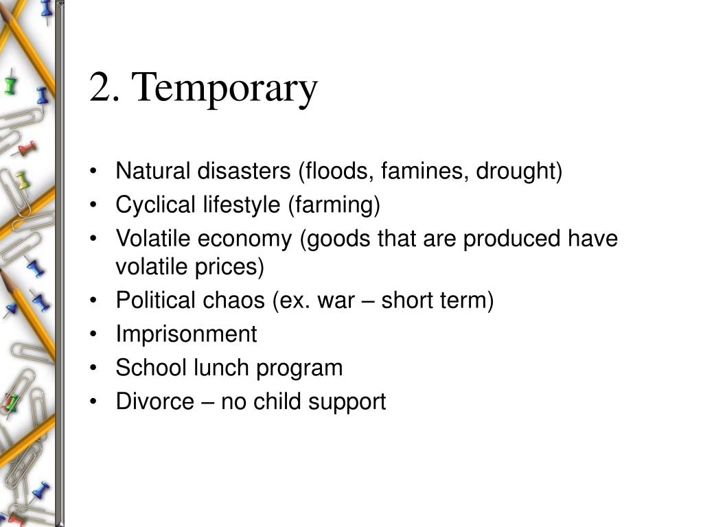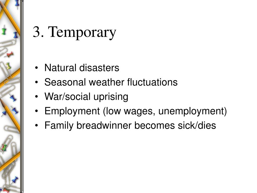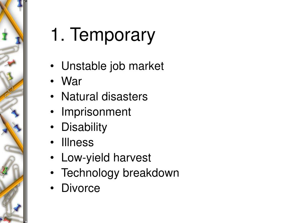 1. Temporary • Unstable job market • War • Natural disasters • Imprisonment • Disability • Illness • Low-yield harvest • Technology breakdown • Divorce