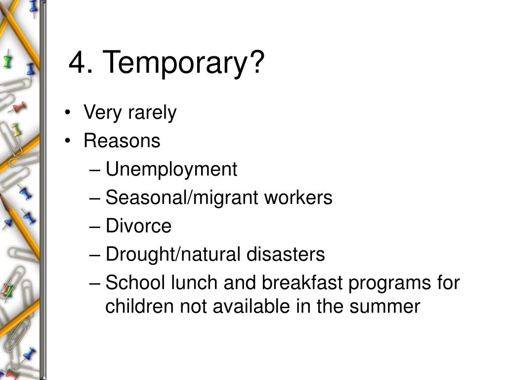 3. Temporary • Natural disasters • Seasonal weather fluctuations • War/social uprising • Employment (low wages, unemployment) • Family breadwinner becomes sick/dies