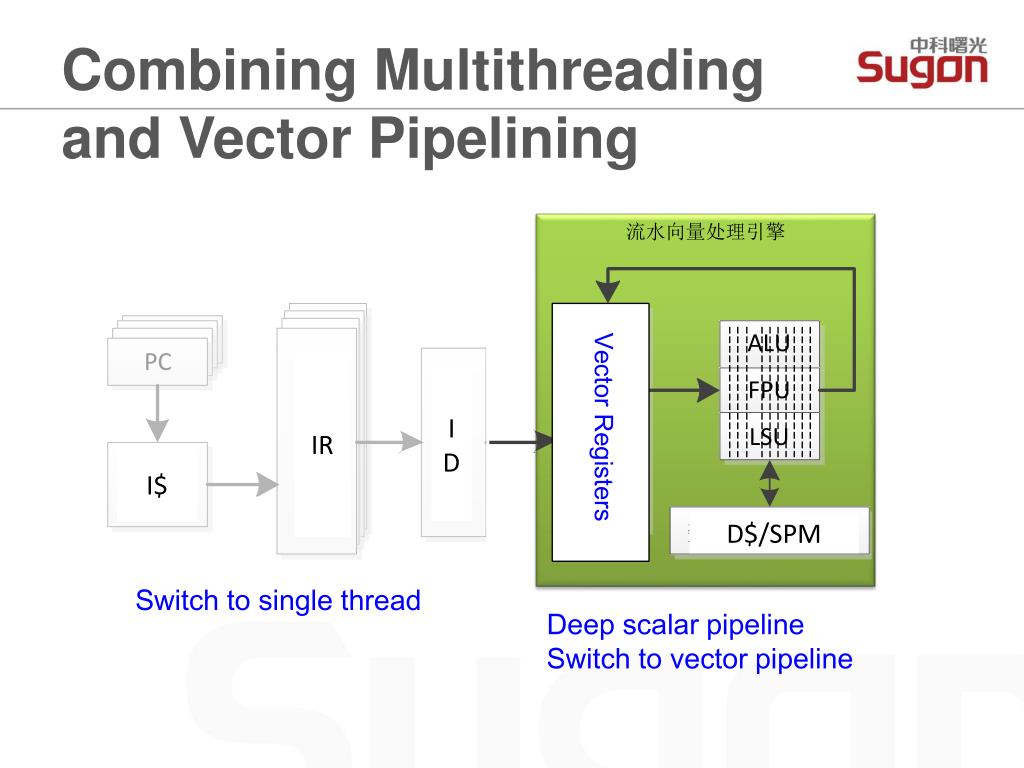 Combining Multithreadingand Vector Pipelining 流水向量处理引擎 Vector Registers IR RF ID I$ D$/SPM Switch to single thread Deep scalar pipeline Switch to vector pipeline