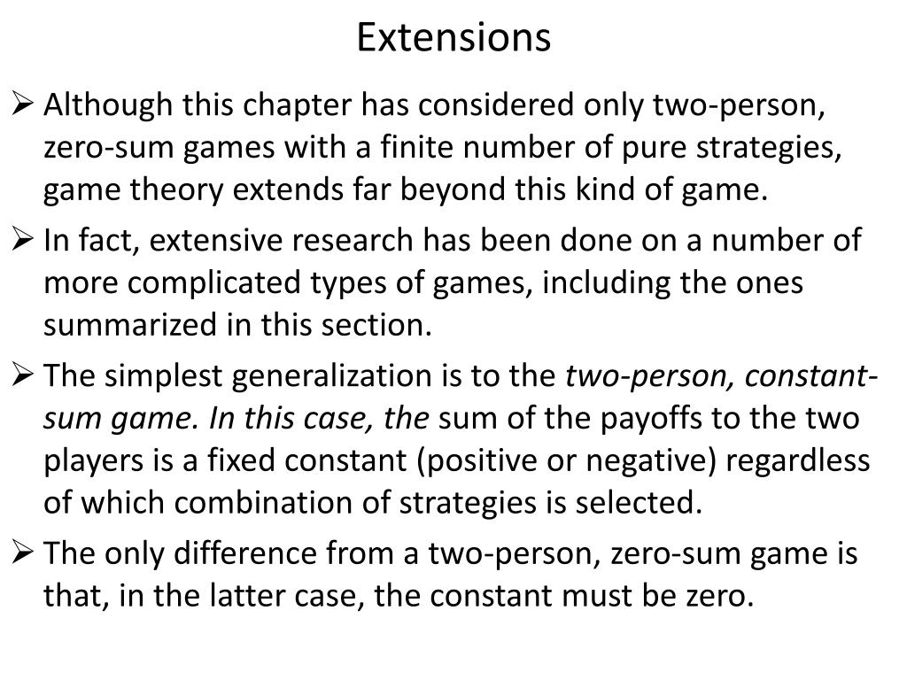 Extensions • Although this chapter has considered only two-person, zero-sum games with a finite number of pure strategies, game theory extends far beyond this kind of game. • In fact, extensive research has been done on a number of more complicated types of games, including the ones summarized in this section. • The simplest generalization is to the two-person, constant-sum game. In this case, the sum of the payoffs to the two players is a fixed constant (positive or negative) regardless of which combination of strategies is selected. • The only difference from a two-person, zero-sum game is that, in the latter case, the constant must be zero.