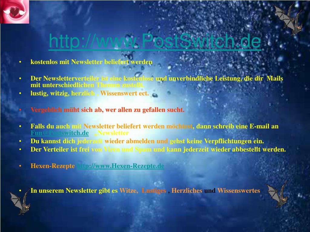 http://www.PostSwitch.de • kostenlos mit Newsletter beliefert werden • Der Newsletterverteiler ist eine kostenlose und unverbindliche Leistung, die dir Mails mit unterschiedlichen Themen zustellt. • lustig, witzig, herzlich , Wissenswert ect. • Vergeblich müht sich ab, wer allen zu gefallen sucht. • Falls du auch mit Newsletter beliefert werden möchtest, dann schreib eine E-mail an Fun@Postswitch.de „Newsletter • Du kannst dich jederzeit wieder abmelden und gehst keine Verpflichtungen ein. • Der Verteiler ist frei von Viren und Spam und kann jederzeit wieder abbestellt werden. • Hexen-Rezeptehttp://www.Hexen-Rezepte.de • In unserem Newsletter gibt esWitze,Lustiges , Herzliches und Wissenswertes