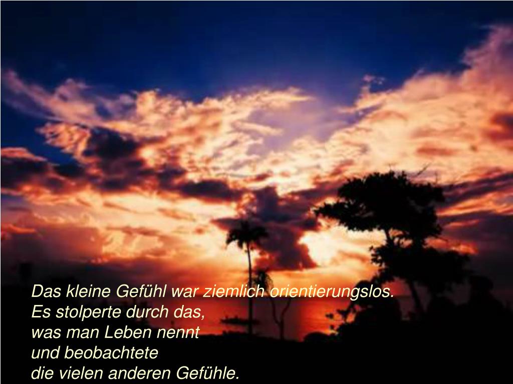 Das kleine Gefühl war ziemlich orientierungslos. Es stolperte durch das, was man Leben nennt und beobachtetedie vielen anderen Gefühle.