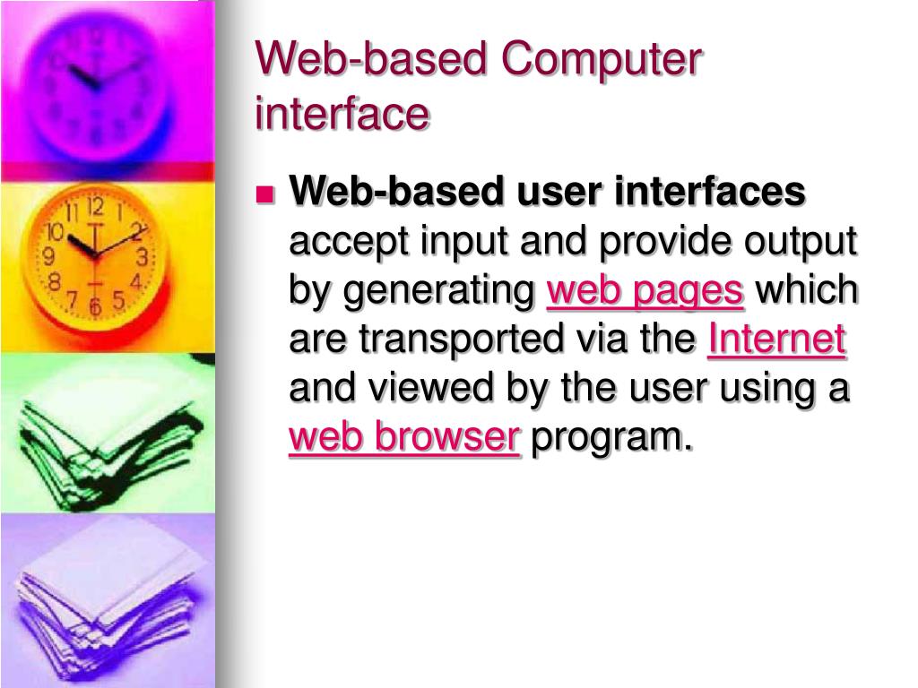 Web-based Computer interface • Web-based user interfaces accept input and provide output by generating web pages which are transported via the Internet and viewed by the user using a web browser program.