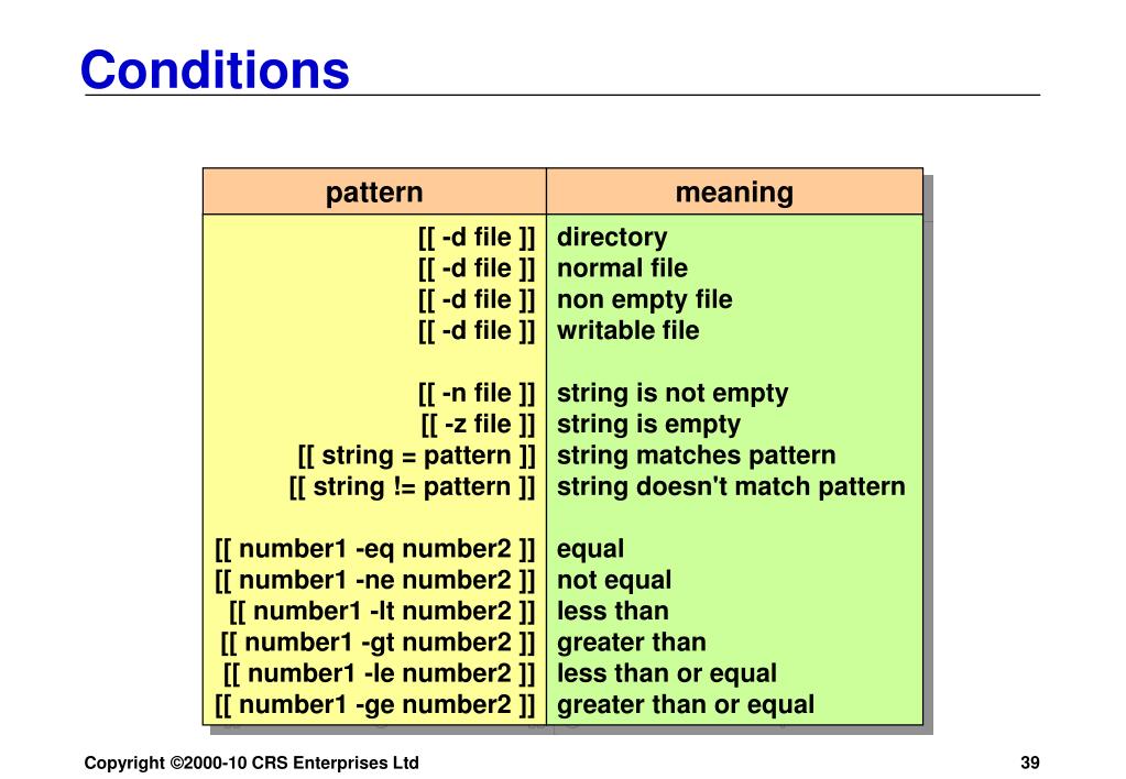 pattern meaning [[ -d file ]] [[ -d file ]] [[ -d file ]] [[ -d file ]] [[ -n file ]] [[ -z file ]] [[ string = pattern ]] [[ string != pattern ]] [[ number1 -eq number2 ]] [[ number1 -ne number2 ]] [[ number1 -lt number2 ]] [[ number1 -gt number2 ]] [[ number1 -le number2 ]] [[ number1 -ge number2 ]] directory normal file non empty file writable file string is not empty string is empty string matches pattern string doesn't match pattern equal not equal less than greater than less than or equal greater than or equal Conditions