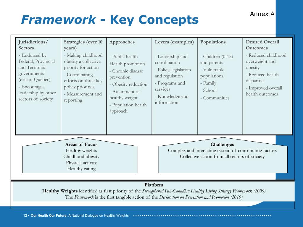 Annex A Framework -Key Concepts Areas of Focus Healthy weights Childhood obesity Physical activity Healthy eating Challenges Complex and interacting system of contributing factors Collective action from all sectors of society Platform Healthy Weights identified as first priority of the Strengthened Pan-Canadian Healthy Living Strategy Framework (2009) The Framework is the first tangible action of the Declaration on Prevention and Promotion (2010) Our Health Our Future: A National Dialogue on Healthy Weights • • • • • • • • • • • • • • • • • • • • • • • • • • • • • • • • • • • • • • • • • • • • • • • • • • • • • • • • • • • • • • • • • •