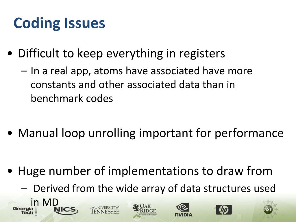 Difficult to keep everything in registers • In a real app, atoms have associated have more constants and other associated data than in benchmark codes • Manual loop unrolling important for performance • Huge number of implementations to draw from • Derived from the wide array of data structures used in MD Coding Issues