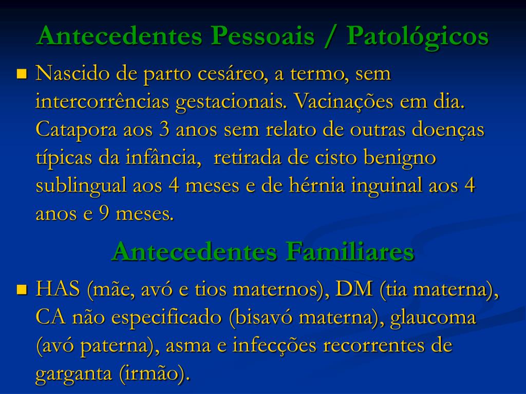 Antecedentes Pessoais / Patológicos • Nascido de parto cesáreo, a termo, sem intercorrências gestacionais. Vacinações em dia. Catapora aos 3 anos sem relato de outras doenças típicas da infância, retirada de cisto benigno sublingual aos 4 meses e de hérnia inguinal aos 4 anos e 9 meses. Antecedentes Familiares • HAS (mãe, avó e tios maternos), DM (tia materna), CA não especificado (bisavó materna), glaucoma (avó paterna), asma e infecções recorrentes de garganta (irmão).