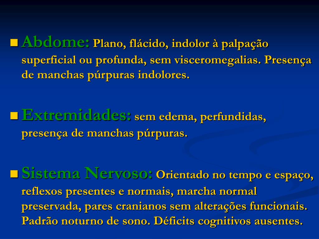 Abdome:Plano, flácido, indolor à palpação superficial ou profunda, sem visceromegalias. Presença de manchas púrpuras indolores. • Extremidades:sem edema, perfundidas, presença de manchas púrpuras. • Sistema Nervoso:Orientado no tempo e espaço, reflexos presentes e normais, marcha normal preservada, pares cranianos sem alterações funcionais. Padrão noturno de sono. Déficits cognitivos ausentes.