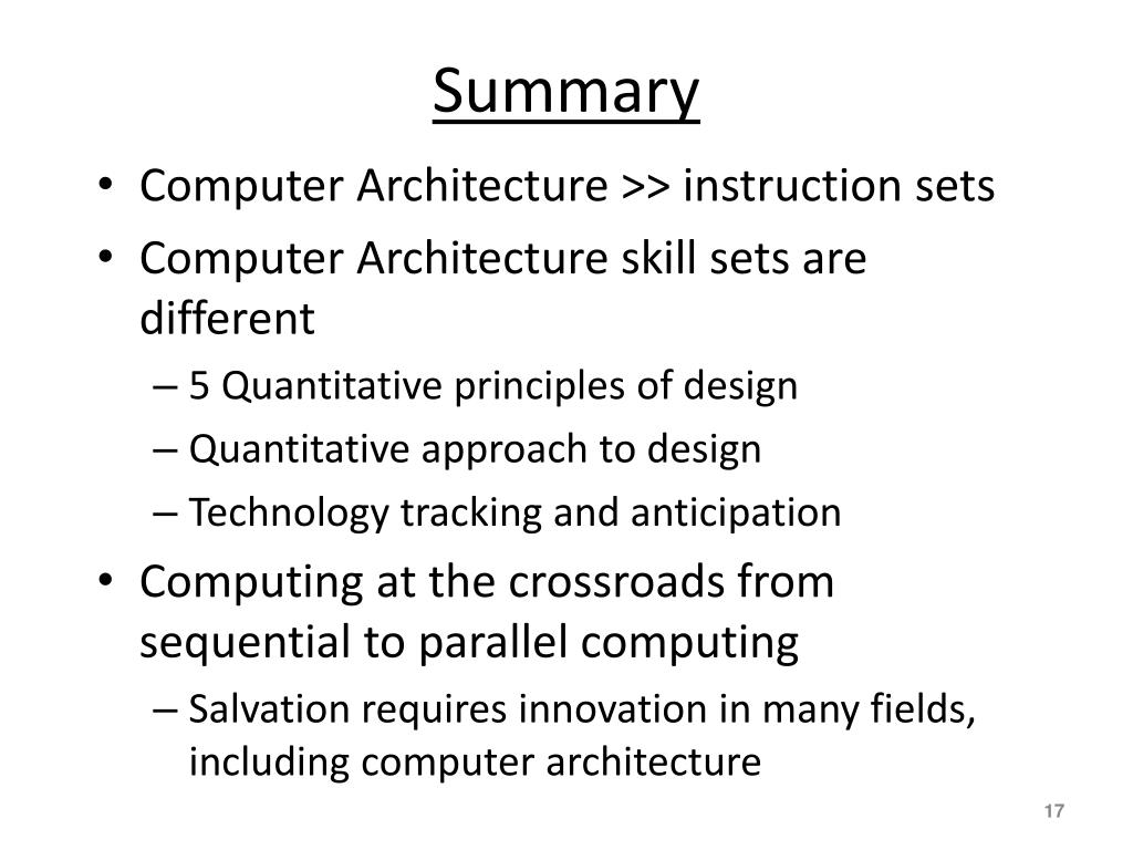Summary • Computer Architecture >> instruction sets • Computer Architecture skill sets are different • 5 Quantitative principles of design • Quantitative approach to design • Technology tracking and anticipation • Computing at the crossroads from sequential to parallel computing • Salvation requires innovation in many fields, including computer architecture