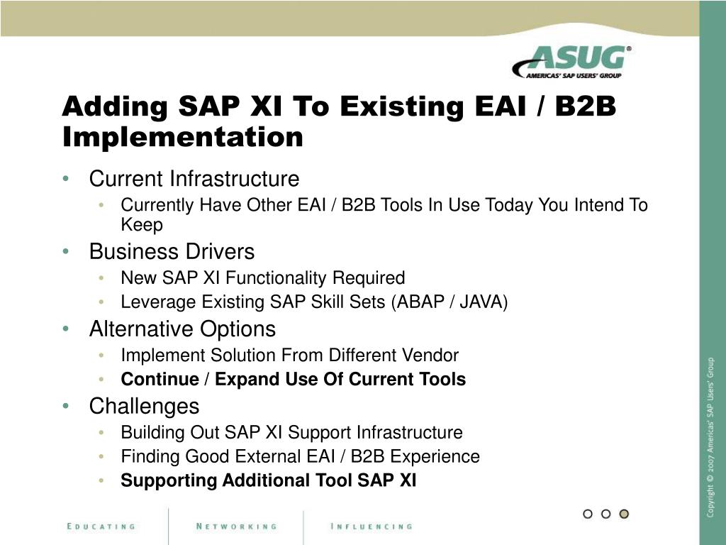 Adding SAP XI To Existing EAI / B2B Implementation • Current Infrastructure • Currently Have Other EAI / B2B Tools In Use Today You Intend To Keep • Business Drivers • New SAP XI Functionality Required • Leverage Existing SAP Skill Sets (ABAP / JAVA) • Alternative Options • Implement Solution From Different Vendor • Continue / Expand Use Of Current Tools • Challenges • Building Out SAP XI Support Infrastructure • Finding Good External EAI / B2B Experience • Supporting Additional Tool SAP XI