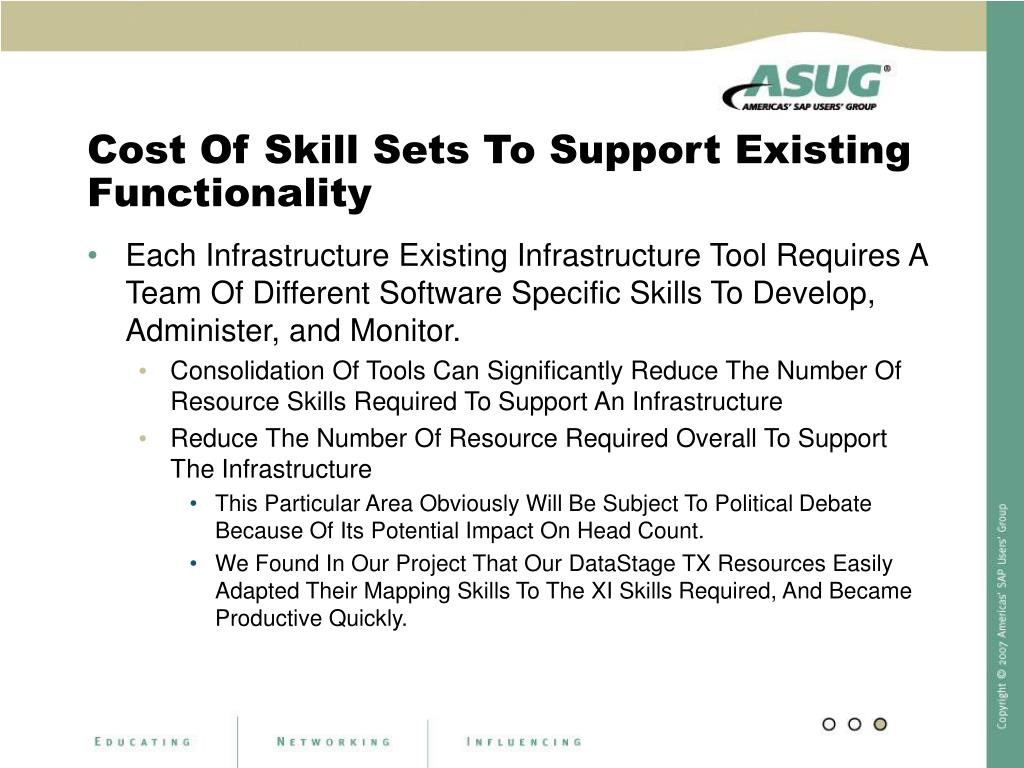 Cost Of Skill Sets To Support Existing Functionality • Each Infrastructure Existing Infrastructure Tool Requires A Team Of Different Software Specific Skills To Develop, Administer, and Monitor. • Consolidation Of Tools Can Significantly Reduce The Number Of Resource Skills Required To Support An Infrastructure • Reduce The Number Of Resource Required Overall To Support The Infrastructure • This Particular Area Obviously Will Be Subject To Political Debate Because Of Its Potential Impact On Head Count. • We Found In Our Project That Our DataStage TX Resources Easily Adapted Their Mapping Skills To The XI Skills Required, And Became Productive Quickly.