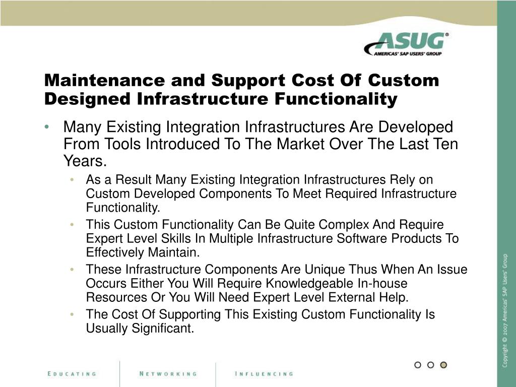 Maintenance and Support Cost Of Custom Designed Infrastructure Functionality • Many Existing Integration Infrastructures Are Developed From Tools Introduced To The Market Over The Last Ten Years. • As a Result Many Existing Integration Infrastructures Rely on Custom Developed Components To Meet Required Infrastructure Functionality. • This Custom Functionality Can Be Quite Complex And Require Expert Level Skills In Multiple Infrastructure Software Products To Effectively Maintain. • These Infrastructure Components Are Unique Thus When An Issue Occurs Either You Will Require Knowledgeable In-house Resources Or You Will Need Expert Level External Help. • The Cost Of Supporting This Existing Custom Functionality Is Usually Significant.