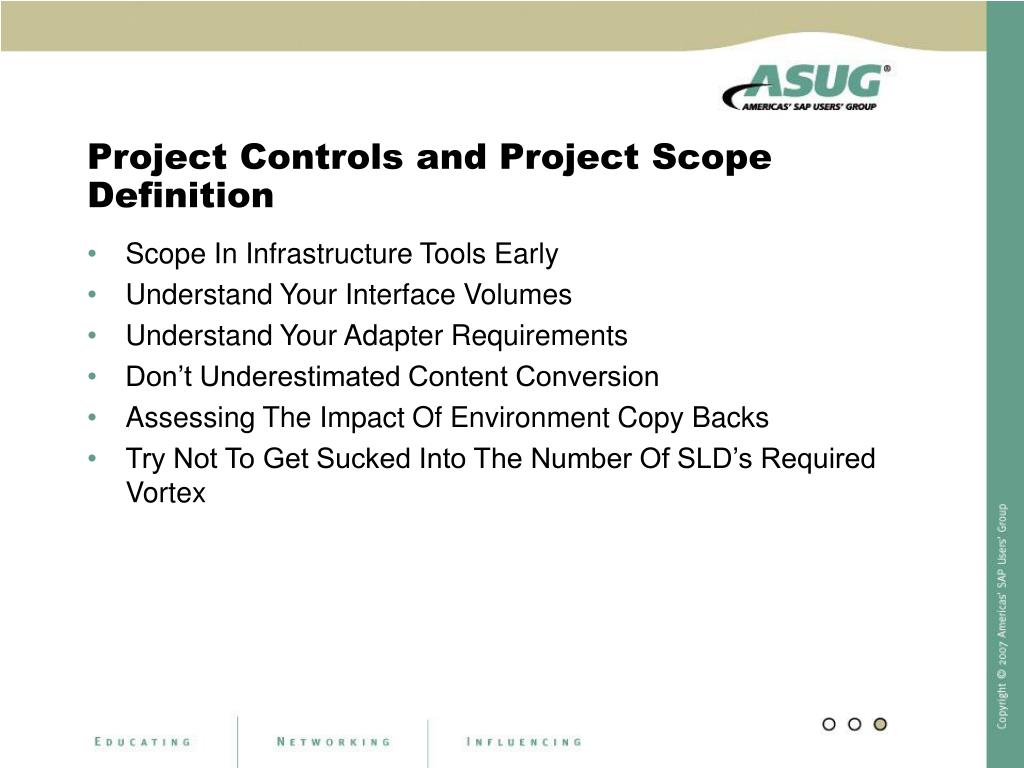 Project Controls and Project Scope Definition • Scope In Infrastructure Tools Early • Understand Your Interface Volumes • Understand Your Adapter Requirements • Don’t Underestimated Content Conversion • Assessing The Impact Of Environment Copy Backs • Try Not To Get Sucked Into The Number Of SLD’s Required Vortex