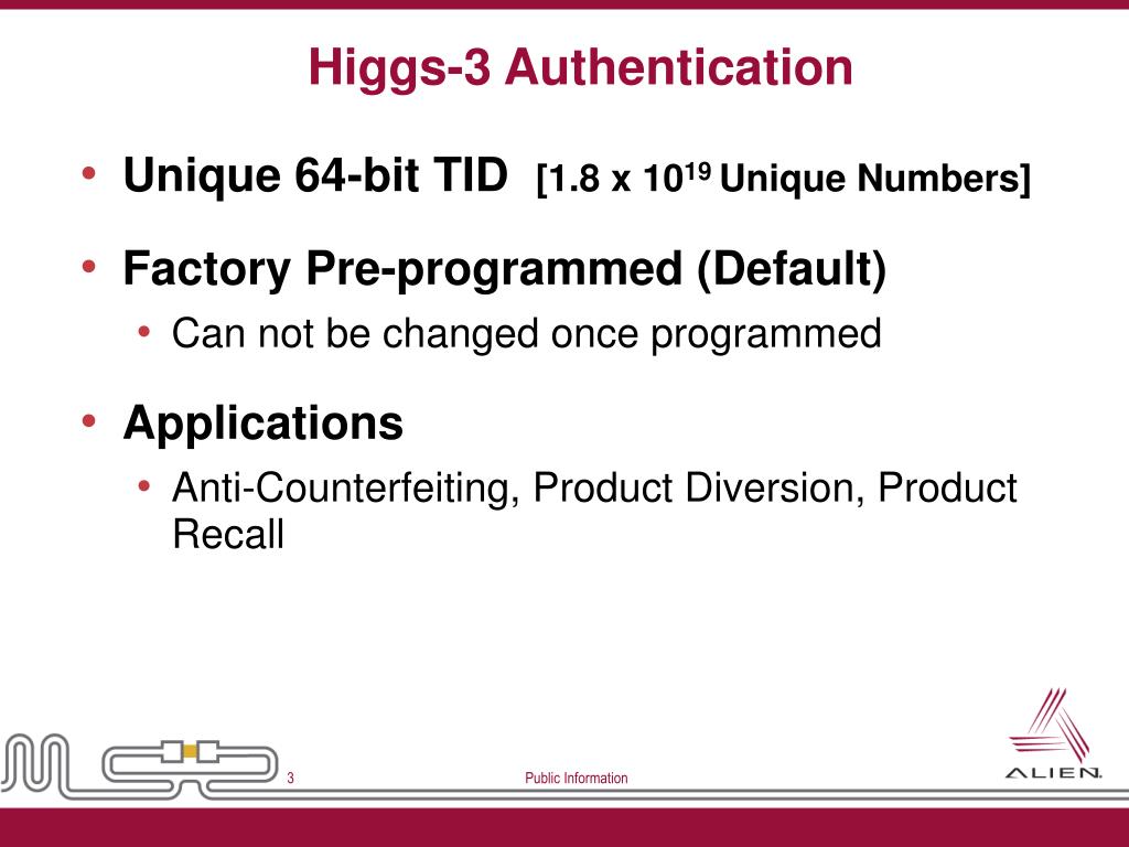 Higgs-3 Authentication Unique 64-bit TID [1.8 x 1019 Unique Numbers] Factory Pre-programmed (Default) Can not be changed once programmed Applications Anti-Counterfeiting, Product Diversion, Product Recall