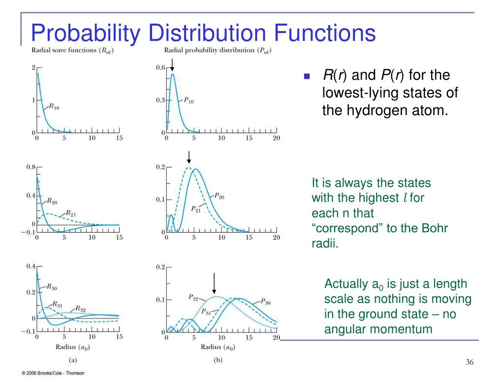 Probability Distribution Functions Are both 1 due to normalization !! The differential volume element in spherical polar coordinates is Therefore, We are only interested in the radial dependence. The radial probability density is P(r) = r2|R(r)|2 and it depends only on n and l.