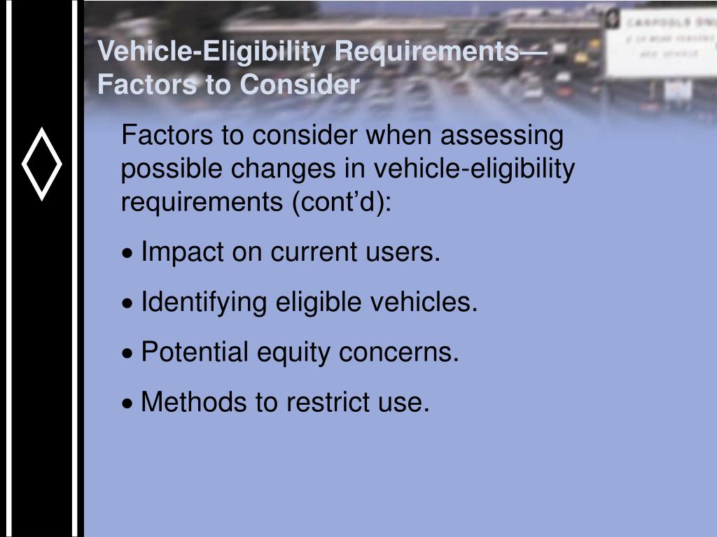Vehicle-Eligibility Requirements—Factors to Consider Factors to consider when assessing possible changes in vehicle-eligibility requirements (cont’d): ·Impact on current users. ·Identifying eligible vehicles. ·Potential equity concerns. ·Methods to restrict use.