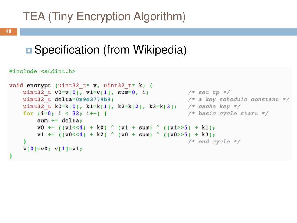 TEA (Tiny Encryption Algorithm) Can also add timing constraints here… • Specification (from Wikipedia)
