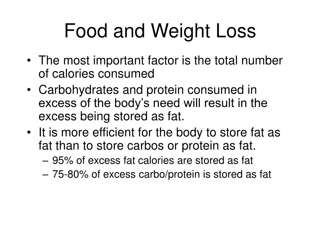 Food and Weight Loss • The most important factor is the total number of calories consumed • Carbohydrates and protein consumed in excess of the body’s need will result in the excess being stored as fat. • It is more efficient for the body to store fat as fat than to store carbos or protein as fat. • 95% of excess fat calories are stored as fat • 75-80% of excess carbo/protein is stored as fat