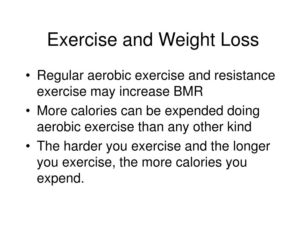 Exercise and Weight Loss • Regular aerobic exercise and resistance exercise may increase BMR • More calories can be expended doing aerobic exercise than any other kind • The harder you exercise and the longer you exercise, the more calories you expend.