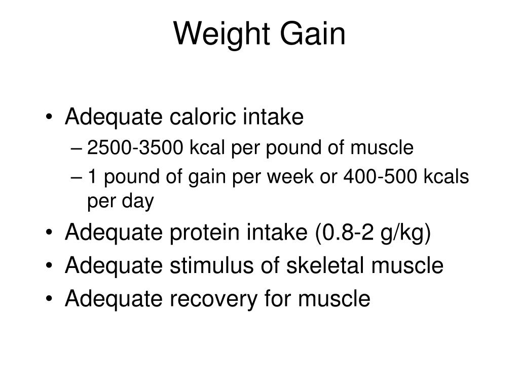 Weight Gain • Adequate caloric intake • 2500-3500 kcal per pound of muscle • 1 pound of gain per week or 400-500 kcals per day • Adequate protein intake (0.8-2 g/kg) • Adequate stimulus of skeletal muscle • Adequate recovery for muscle • Adequate hormonal environment • Timing of protein intake • Supplements