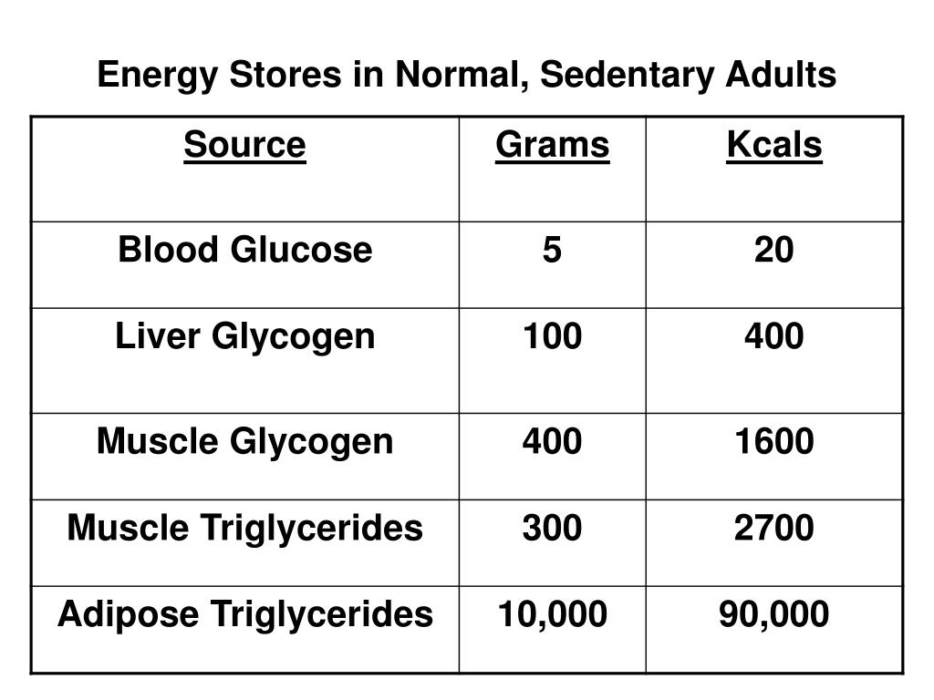 Characteristics of Fat That Make it Preferential to CHO as a Storage Substrate • More than 2X as much energy per gram • 1 gm fat = 9 kcals • 1 gm CHO = 4 kcals • Not hydrated when stored • For every gram of glycogen stored, 3 grams of water are stored. • Average person would have 50-75 additional pounds as water if fat were hydrated to the same extent as water.
