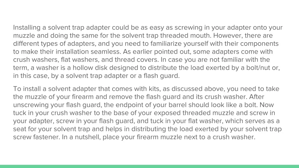 Installing a solvent trap adapter could be as easy as screwing in your adapter onto your muzzle and doing the same for the solvent trap threaded mouth. However, there are different types of adapters, and you need to familiarize yourself with their components to make their installation seamless. As earlier pointed out, some adapters come with crush washers, flat washers, and thread covers. In case you are not familiar with the term, a washer is a hollow disk designed to distribute the load exerted by a bolt/nut or, in this case, by a solvent trap adapter or a flash guard. To install a solvent adapter that comes with kits, as discussed above, you need to take the muzzle of your firearm and remove the flash guard and its crush washer. After unscrewing your flash guard, the endpoint of your barrel should look like a bolt. Now tuck in your crush washer to the base of your exposed threaded muzzle and screw in your adapter, screw in your flash guard, and tuck in your flat washer, which serves as a seat for your solvent trap and helps in distributing the load exerted by your solvent trap screw fastener. In a nutshell, place your firearm muzzle next to a crush washer.