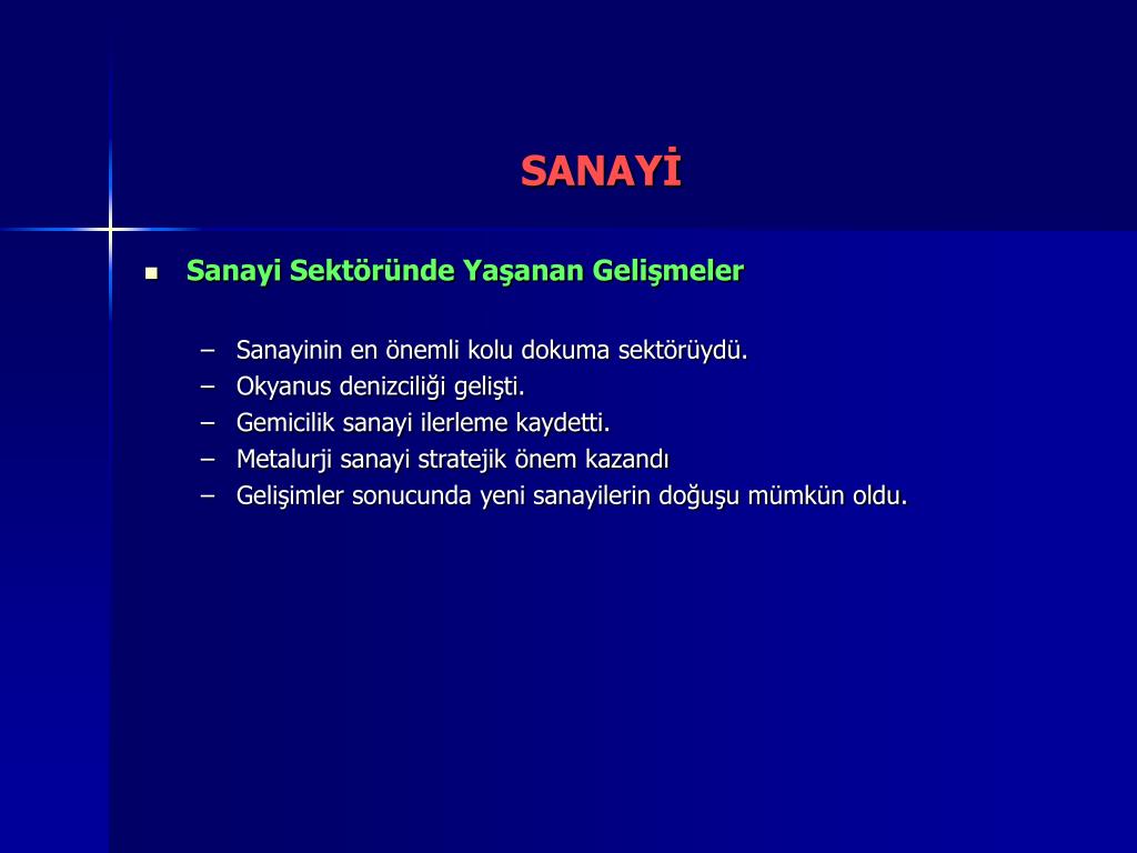 SANAYİ • Sanayi Sektöründe Yaşanan Gelişmeler • Sanayinin en önemli kolu dokuma sektörüydü. • Okyanus denizciliği gelişti. • Gemicilik sanayi ilerleme kaydetti. • Metalurji sanayi stratejik önem kazandı • Gelişimler sonucunda yeni sanayilerin doğuşu mümkün oldu.