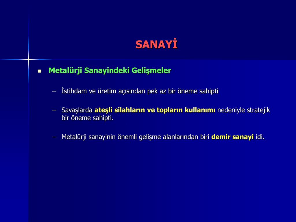 SANAYİ • Metalürji Sanayindeki Gelişmeler • İstihdam ve üretim açısından pek az bir öneme sahipti • Savaşlarda ateşli silahların ve topların kullanımı nedeniyle stratejik bir öneme sahipti. • Metalürji sanayinin önemli gelişme alanlarından biri demir sanayi idi.