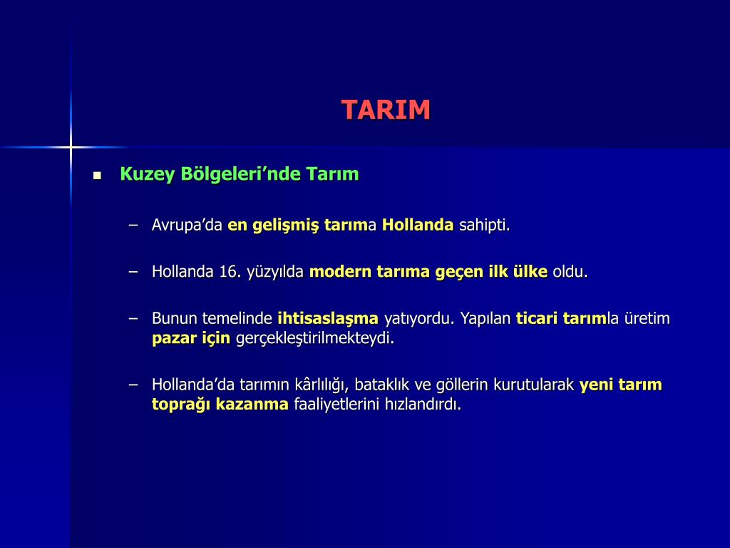 TARIM • Tarımda yaşanan gelişmeler • Avrupa’da nüfus artış hızı azaldı • Doğu Avrupa’da hür köylüler serfleştirildi • Akdeniz Bölgesi’nde farklılıklar yaygınlaştı • İspanyol tarımı geriledi • Açık tarla sistemi varlığını sürdür • Hollanda tarımda büyük gelişme yakaladı