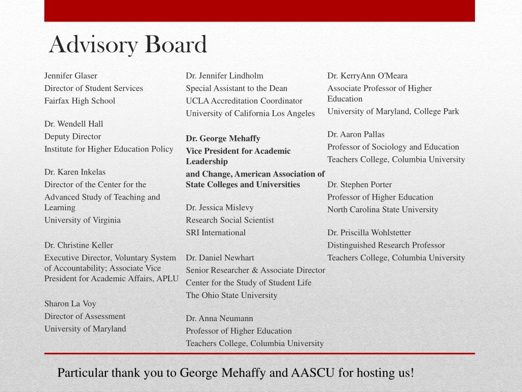 Advisory Board Jennifer Glaser Director of Student Services Fairfax High School Dr. Wendell Hall Deputy Director Institute for Higher Education Policy Dr. Karen Inkelas Director of the Center for the Advanced Study of Teaching and Learning University of Virginia Dr. Christine Keller Executive Director, Voluntary System of Accountability; Associate Vice President for Academic Affairs, APLU Sharon La Voy Director of Assessment University of Maryland Dr. Jennifer Lindholm Special Assistant to the Dean UCLA Accreditation Coordinator University of California Los Angeles Dr. George Mehaffy Vice President for Academic Leadership and Change, American Association of State Colleges and Universities Dr. Jessica Mislevy Research Social Scientist SRI International Dr. Daniel Newhart Senior Researcher & Associate Director Center for the Study of Student Life The Ohio State University Dr. Anna Neumann Professor of Higher Education Teachers College, Columbia University Dr. KerryAnn O'Meara Associate Professor of Higher Education University of Maryland, College Park Dr. Aaron Pallas Professor of Sociology and Education Teachers College, Columbia University Dr. Stephen Porter Professor of Higher Education North Carolina State University Dr. Priscilla Wohlstetter Distinguished Research Professor Teachers College, Columbia University Particular thank you to George Mehaffy and AASCU for hosting us!