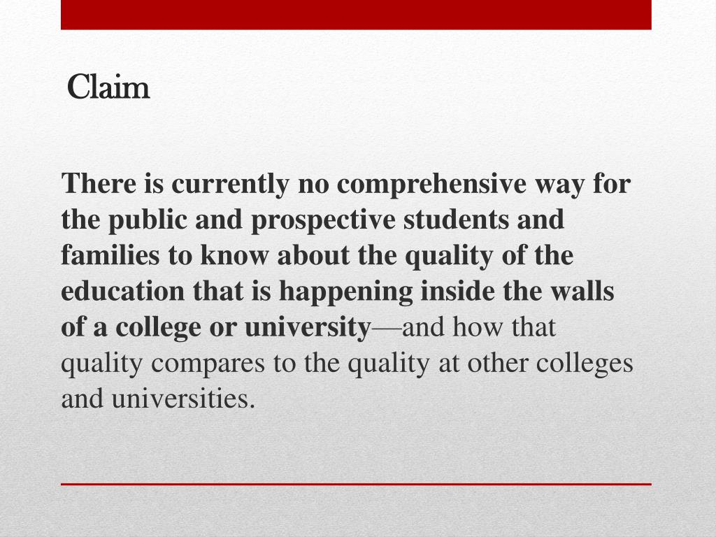 Claim There is currently no comprehensive way for the public and prospective students and families to know about the quality of the education that is happening inside the walls of a college or university—and how that quality compares to the quality at other colleges and universities.