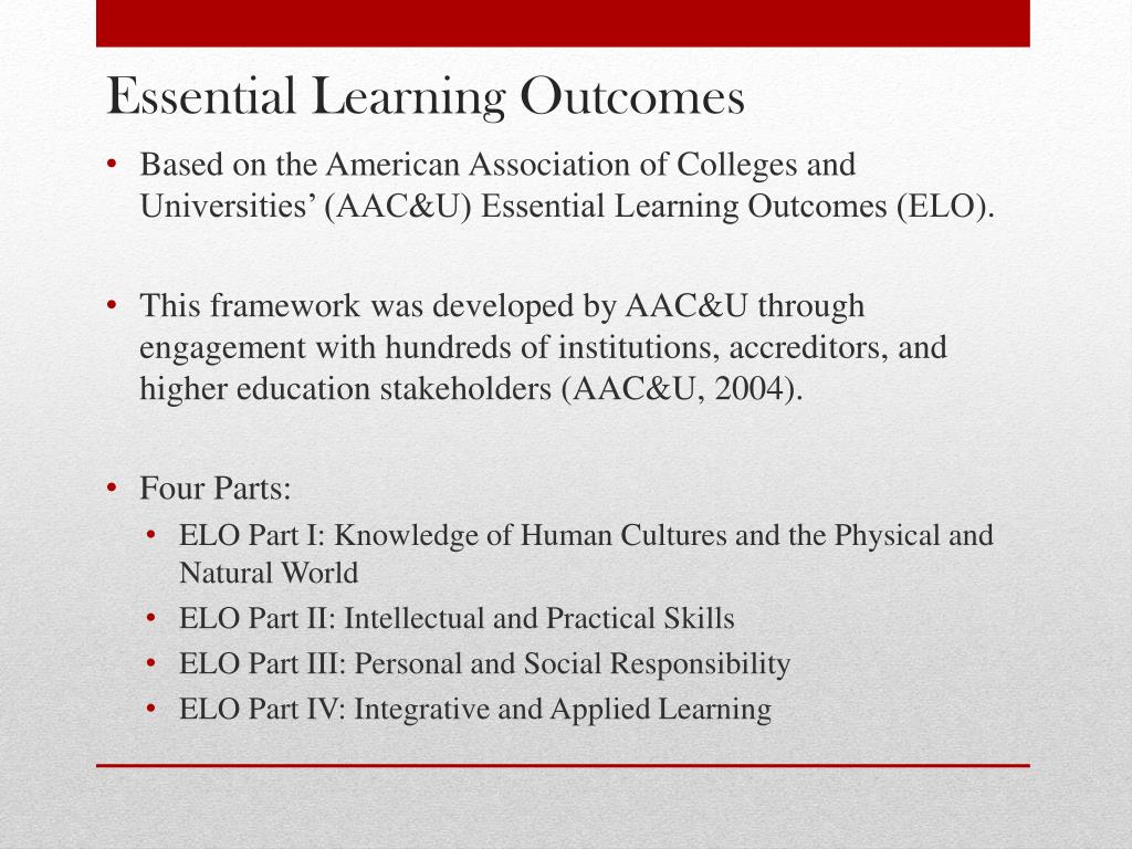 Essential Learning Outcomes • Based on the American Association of Colleges and Universities’ (AAC&U) Essential Learning Outcomes (ELO). • This framework was developed by AAC&U through engagement with hundreds of institutions, accreditors, and higher education stakeholders (AAC&U, 2004). • Four Parts: • ELO Part I: Knowledge of Human Cultures and the Physical and Natural World • ELO Part II: Intellectual and Practical Skills • ELO Part III: Personal and Social Responsibility • ELO Part IV: Integrative and Applied Learning