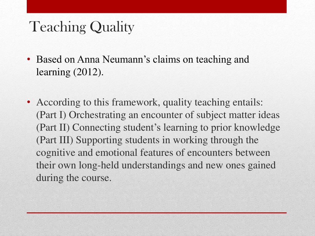 Teaching Quality • Based on Anna Neumann’s claims on teaching and learning (2012). • According to this framework, quality teaching entails: (Part I) Orchestrating an encounter of subject matter ideas (Part II) Connecting student’s learning to prior knowledge (Part III) Supporting students in working through the cognitive and emotional features of encounters between their own long-held understandings and new ones gained during the course.