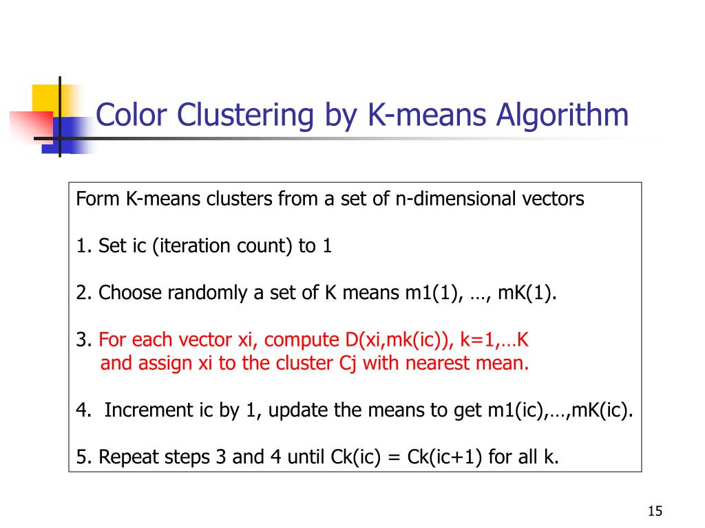 Color Clustering by K-means Algorithm Form K-means clusters from a set of n-dimensional vectors 1. Set ic (iteration count) to 1 2. Choose randomly a set of K means m1(1), …, mK(1). 3. For each vector xi, compute D(xi,mk(ic)), k=1,…K and assign xi to the cluster Cj with nearest mean. 4. Increment ic by 1, update the means to get m1(ic),…,mK(ic). 5. Repeat steps 3 and 4 until Ck(ic) = Ck(ic+1) for all k.