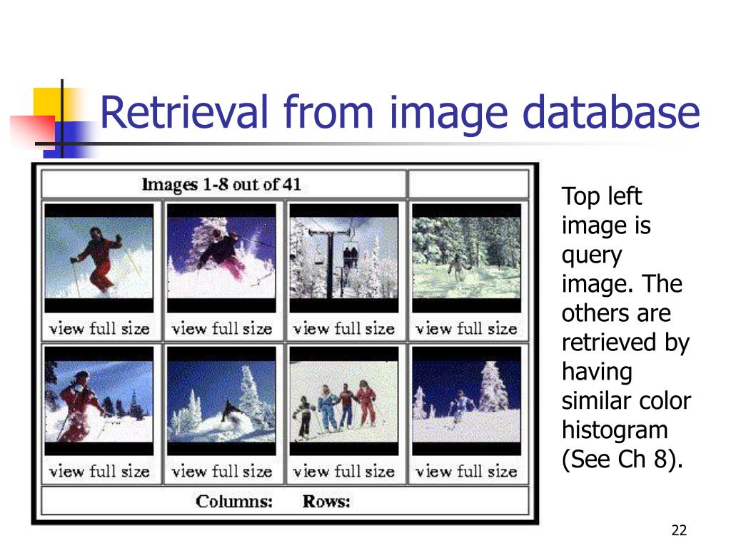 Retrieval from image database Top left image is query image. The others are retrieved by having similar color histogram (See Ch 8).