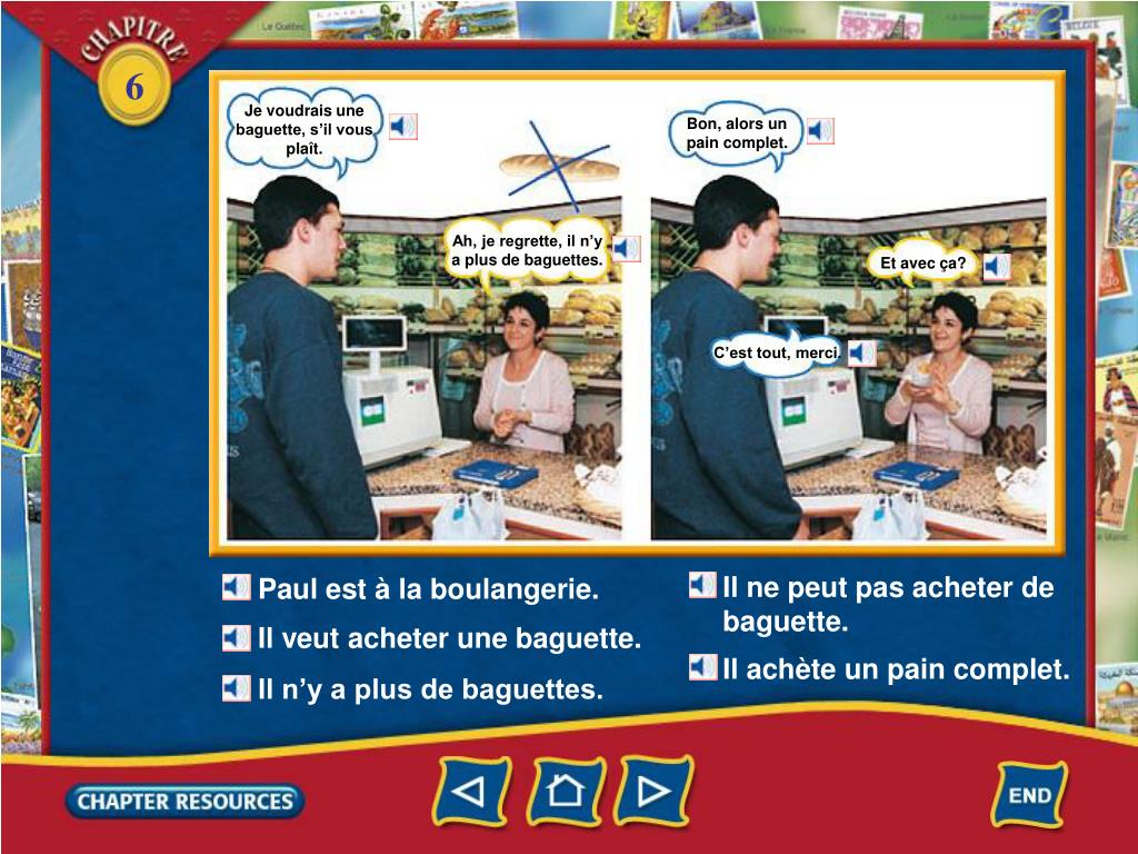 Je voudrais une baguette, s’il vous plaît. Bon, alors un pain complet. Ah, je regrette, il n’y a plus de baguettes. Et avec ça? C’est tout, merci. Il ne peut pas acheter de baguette. Paul est à la boulangerie. Il veut acheter une baguette. Il achète un pain complet. Il n’y a plus de baguettes.