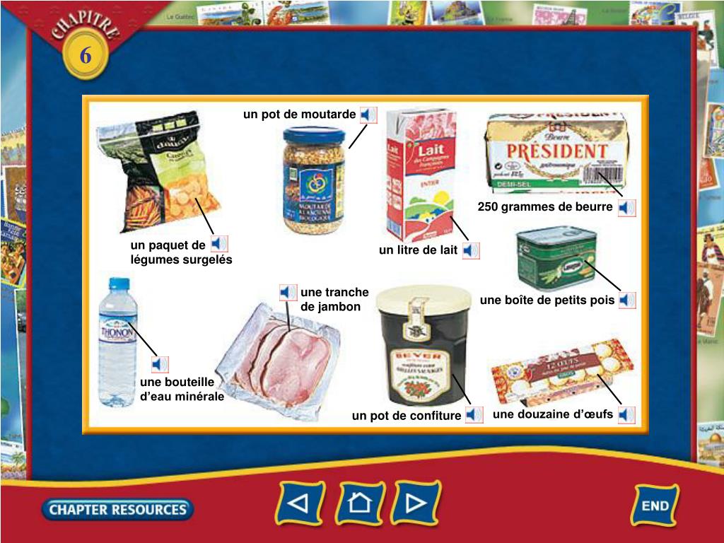 un pot de moutarde 250 grammes de beurre un paquet de légumes surgelés un litre de lait une tranche de jambon une boîte de petits pois une bouteille d’eau minérale une douzaine d’œufs un pot de confiture