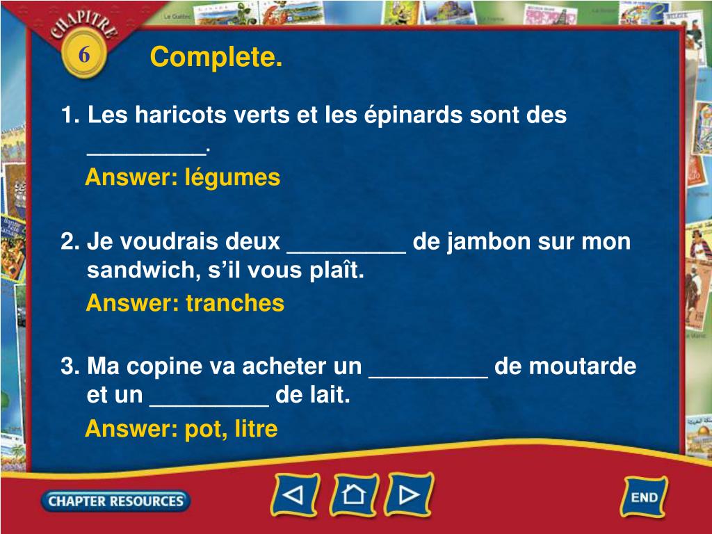 Complete. • Les haricots verts et les épinards sont des _________. Answer: légumes 2. Je voudrais deux _________ de jambon sur mon sandwich, s’il vous plaît. Answer: tranches 3. Ma copine va acheter un _________ de moutarde et un _________ de lait. Answer: pot, litre