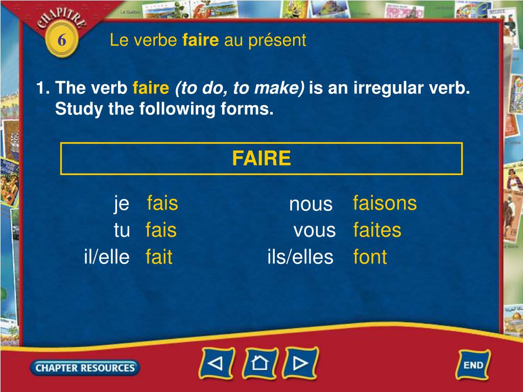 Le verbe faire au présent 1. The verb faire(to do, to make) is an irregular verb. Study the following forms. FAIRE fais faisons je nous tu fais vous faites il/elle fait ils/elles font