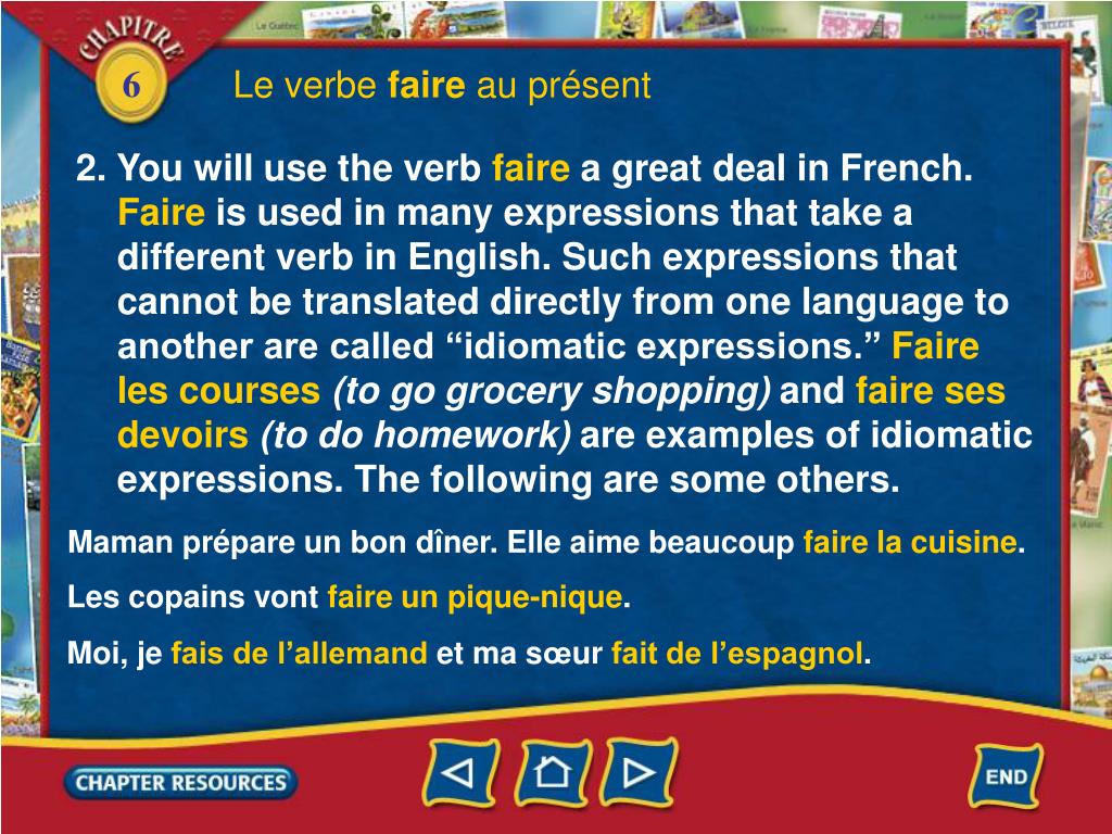 Le verbe faire au présent 2. You will use the verb faire a great deal in French. Faire is used in many expressions that take a different verb in English. Such expressions that cannot be translated directly from one language to another are called “idiomatic expressions.” Faire les courses(to go grocery shopping) and faire ses devoirs(to do homework) are examples of idiomatic expressions. The following are some others. Maman prépare un bon dîner.Elle aime beaucoup faire la cuisine. Les copains vont faire un pique-nique. Moi, je fais de l’allemand et ma sœur fait de l’espagnol.