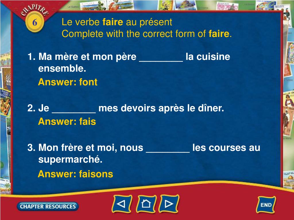 Le verbe faire au présent Complete with the correct form of faire. • Ma mère et mon père ________ la cuisine • ensemble. Answer: font 2. Je ________ mes devoirs après le dîner. Answer: fais 3. Mon frère et moi, nous ________ les courses au supermarché. Answer: faisons