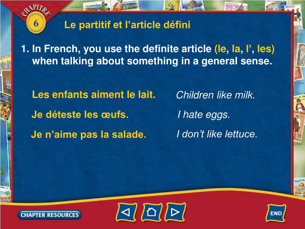 Le partitif et l’article défini 1. In French, you use the definite article (le, la, l’, les) when talking about something in a general sense. Les enfants aiment le lait. Children like milk. Je déteste les œufs. I hate eggs. I don’t like lettuce. Je n’aime pas la salade.