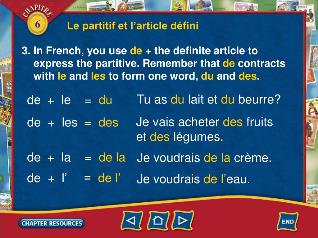 Le partitif et l’article défini 3. In French, you use de + the definite article to express the partitive. Remember that de contracts with le and les to form one word, du and des. Tu as du lait et du beurre? de+ le = du Je vais acheter des fruits et des légumes. de+ les = des de+ la = de la Je voudrais de la crème. de + l’ = de l’ Je voudrais del’eau.