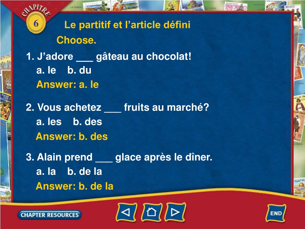 1. J’adore ___ gâteau au chocolat! a. leb. du 2. Vous achetez ___ fruits au marché? a. lesb. des 3. Alain prend ___ glace après le dîner. a. lab. de la Le partitif et l’article défini Choose. Answer: a. le Answer: b. des Answer: b. de la