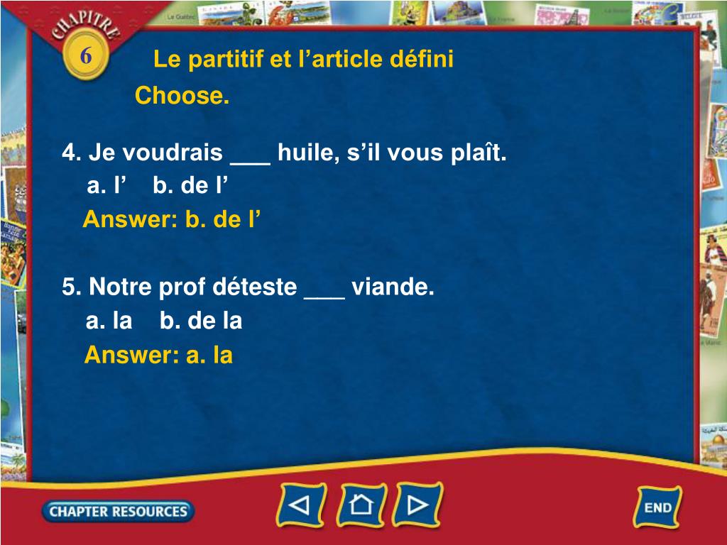 4. Je voudrais ___ huile, s’il vous plaît. a. l’b. de l’ 5. Notre prof déteste ___ viande. a. lab. de la Le partitif et l’article défini Choose. Answer: b. de l’ Answer: a. la